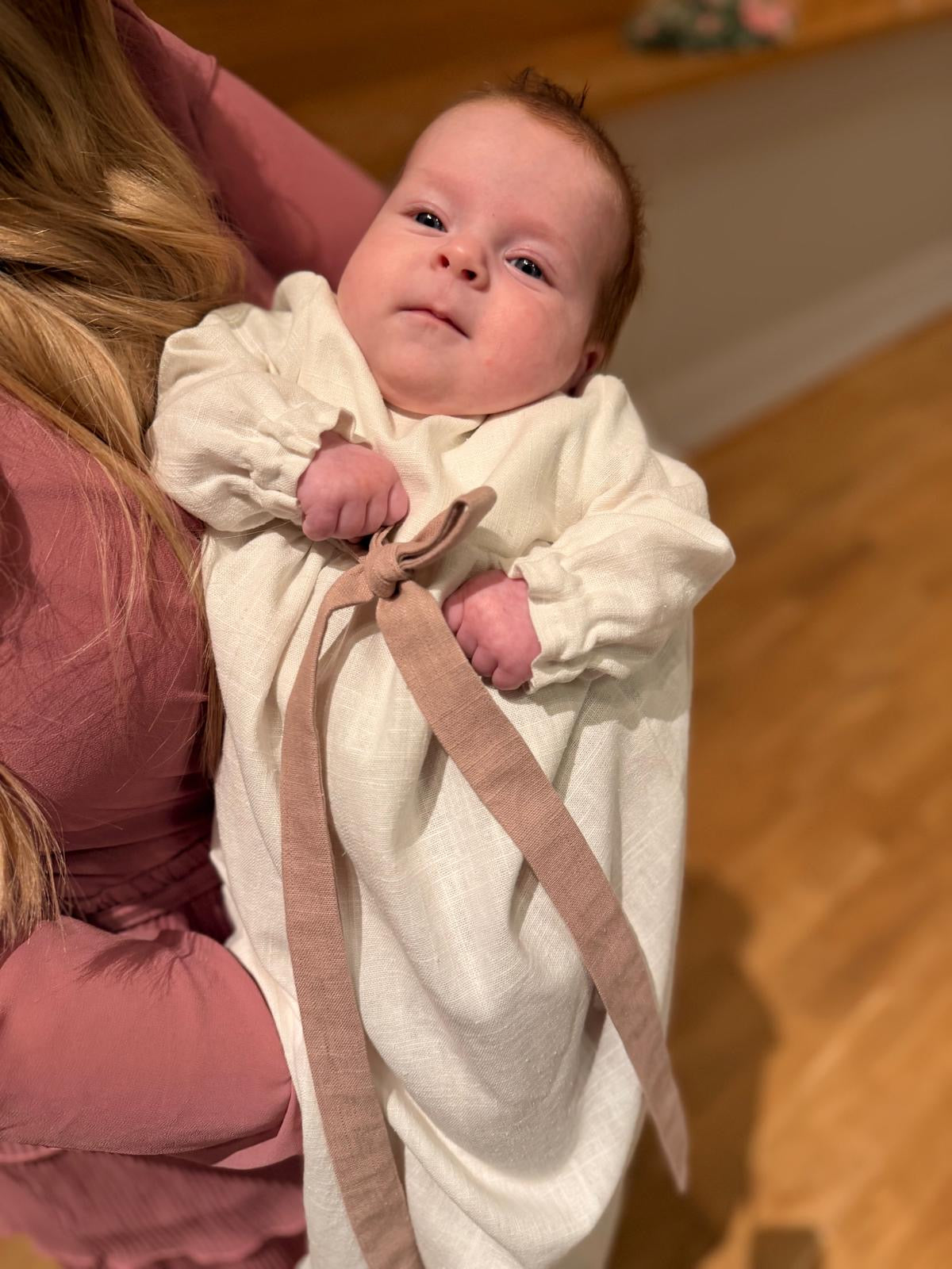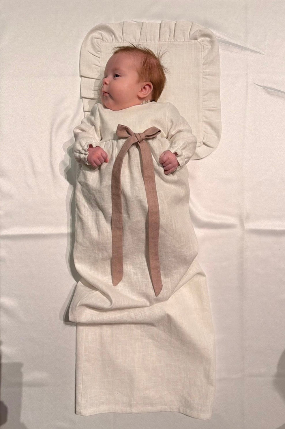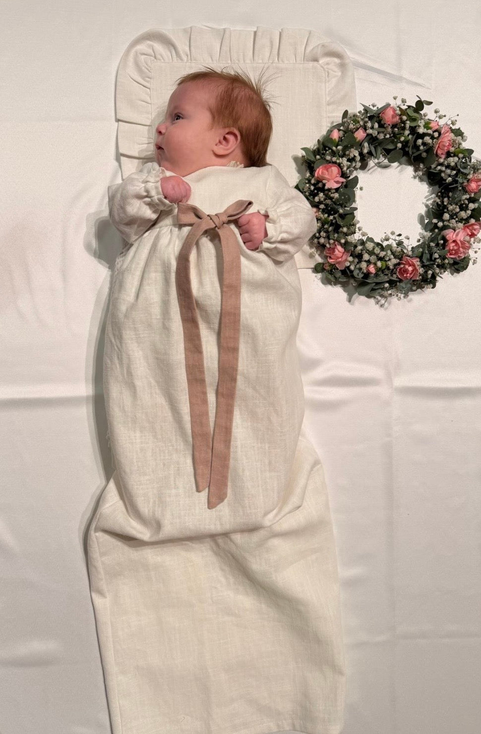 Lisätuotteena voit valita pellavaisen kasteliinan. Liina on samaa sävyä mekon kanssa, jos siis valitset hiekan värisen mekon, liina on hiekan sävyinen. Liinassa on kaunis rypytetty reunus. Kasteliinaa ei myydä erikseen.
