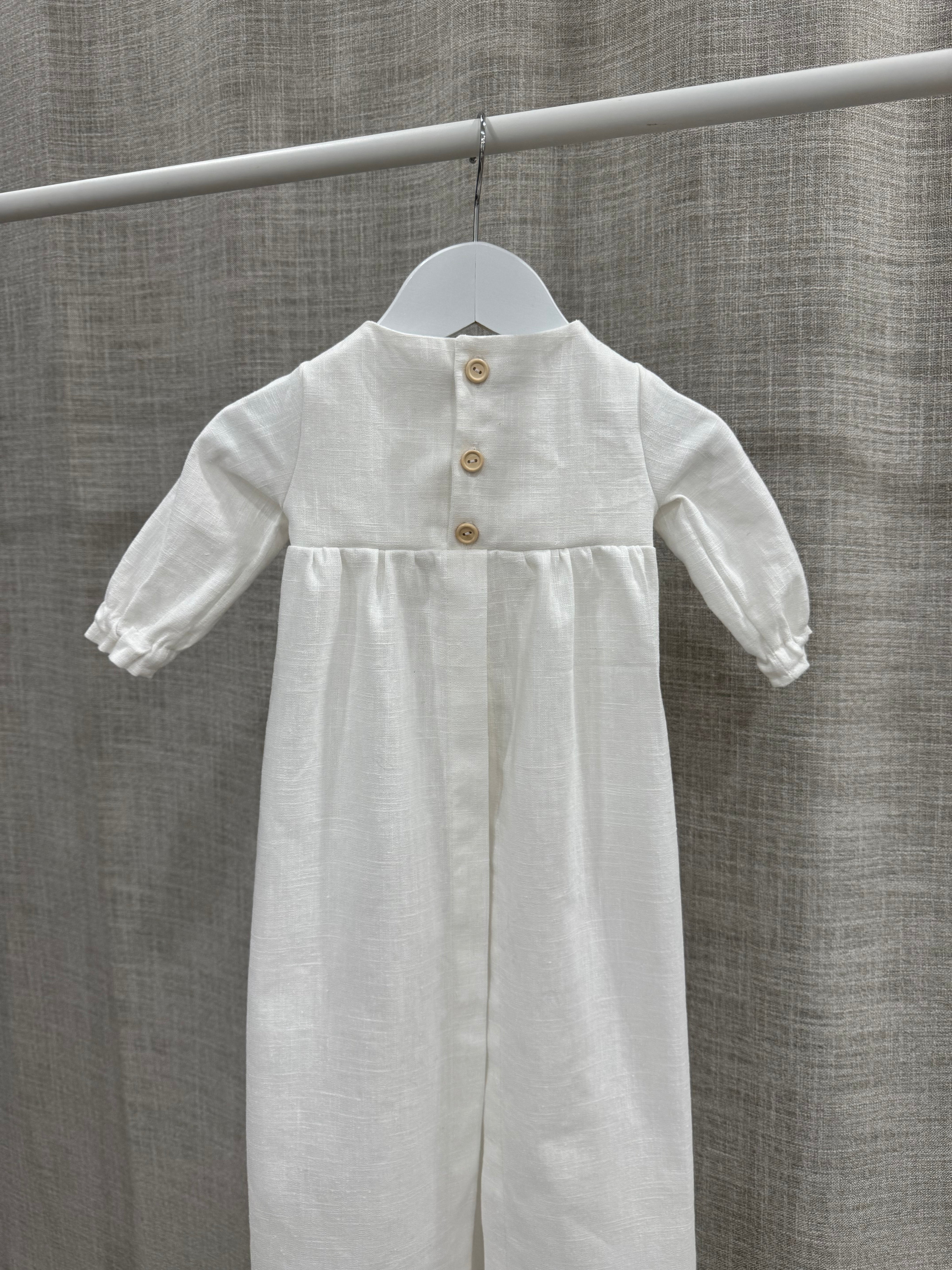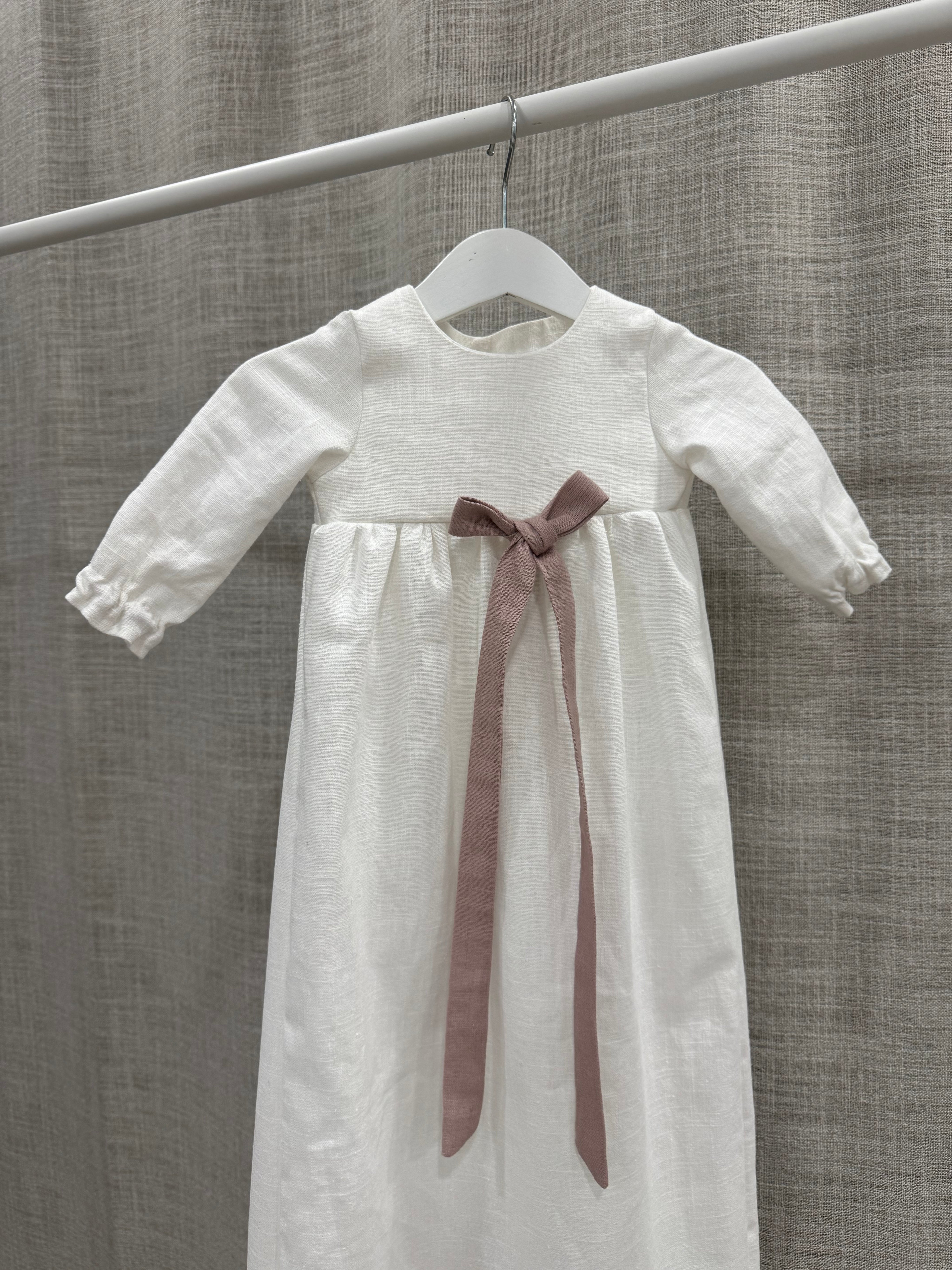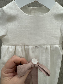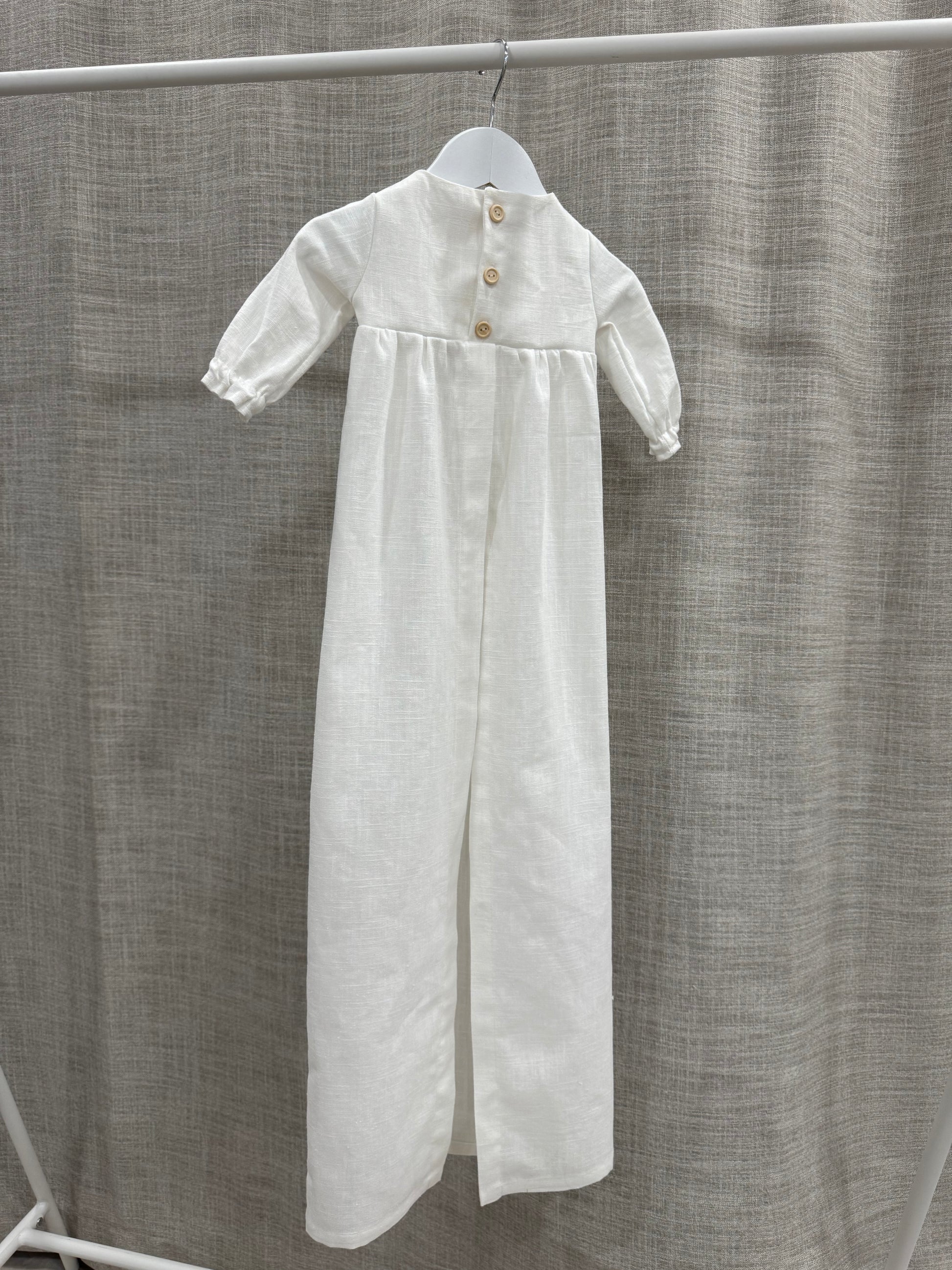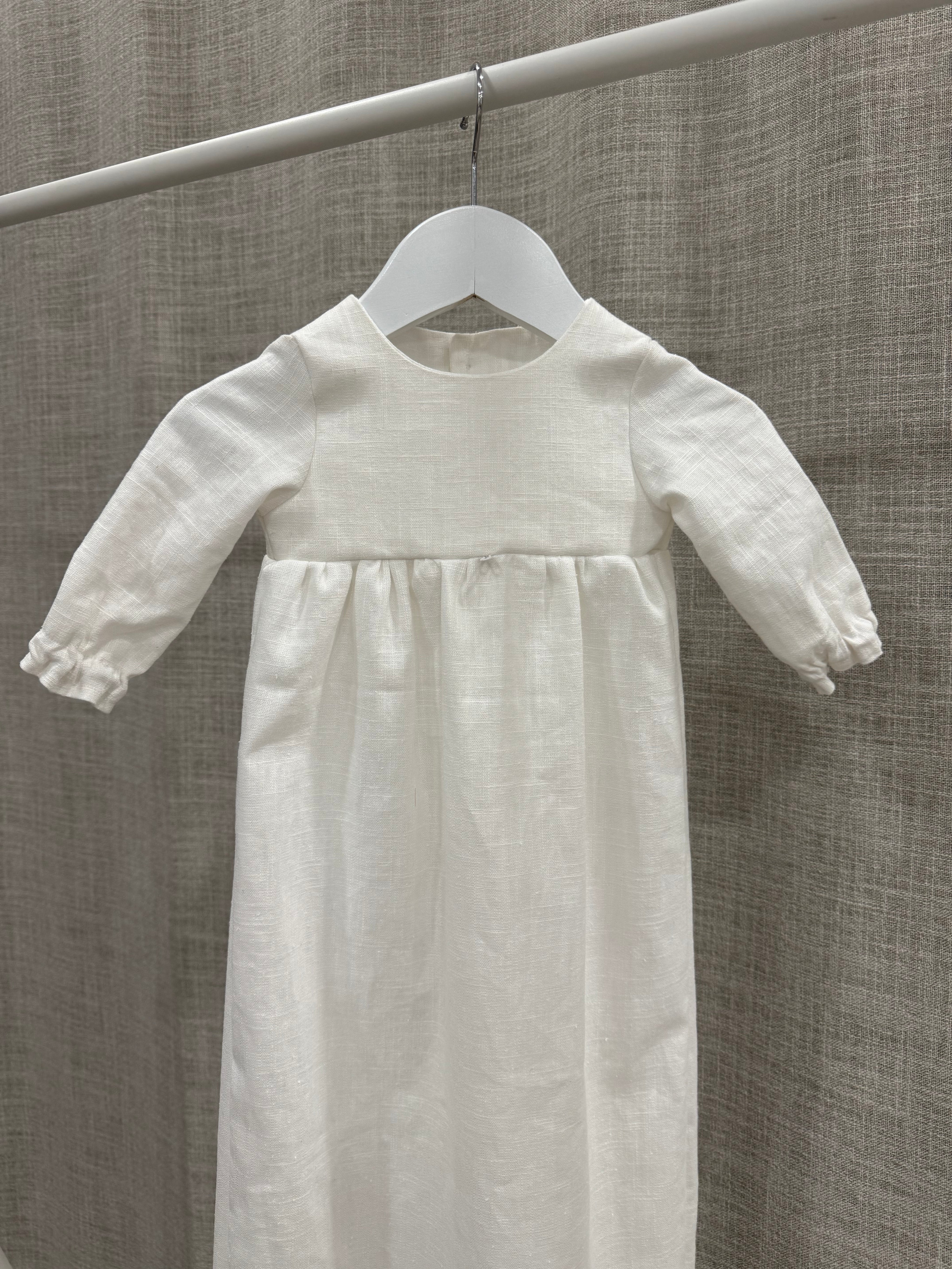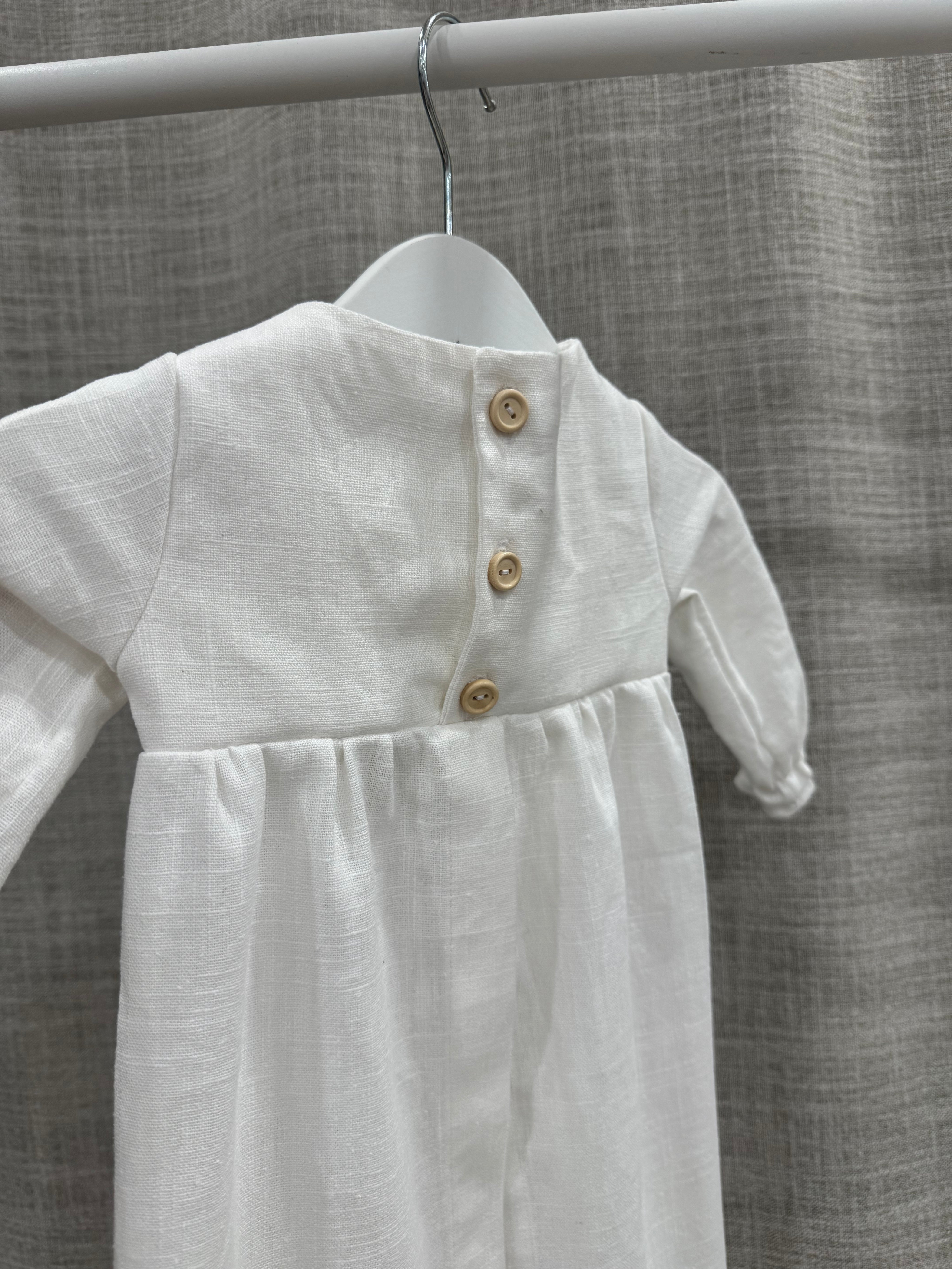 Nykyaikainen, yksinkertainen kastemekko pellavasta. Mekossa on napit yläosassa ja pitkä takaa avoin helma. Hihansuissa on kuminauhat ja pienet rypytykset. Mekko sopii koossa 50-62cm.