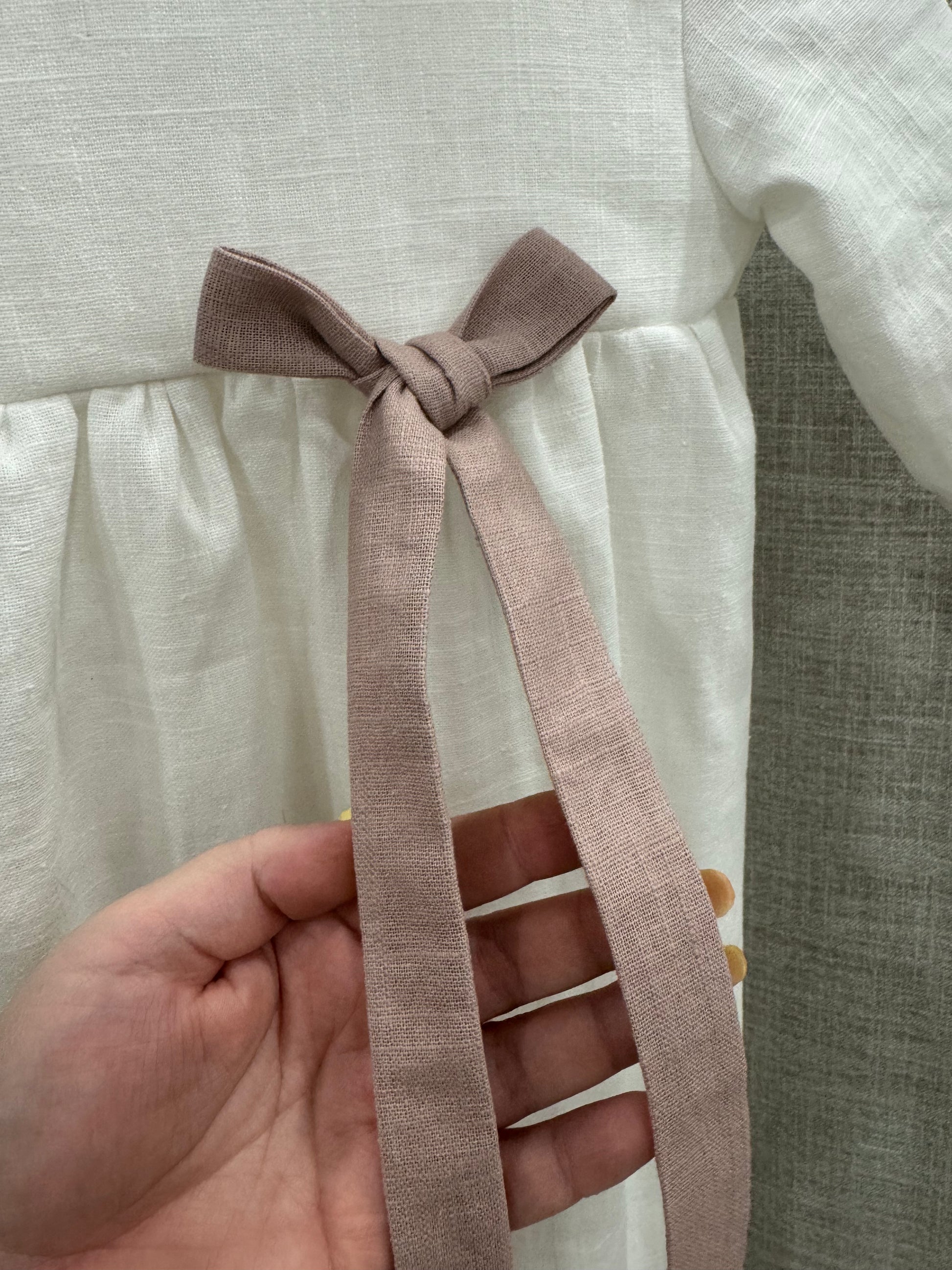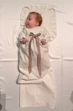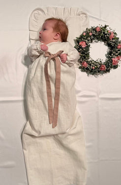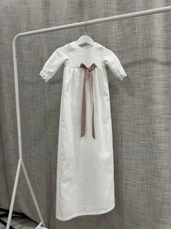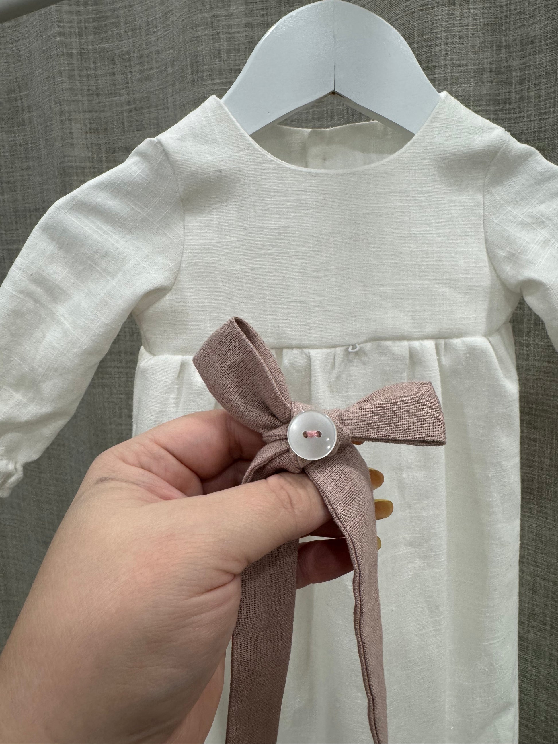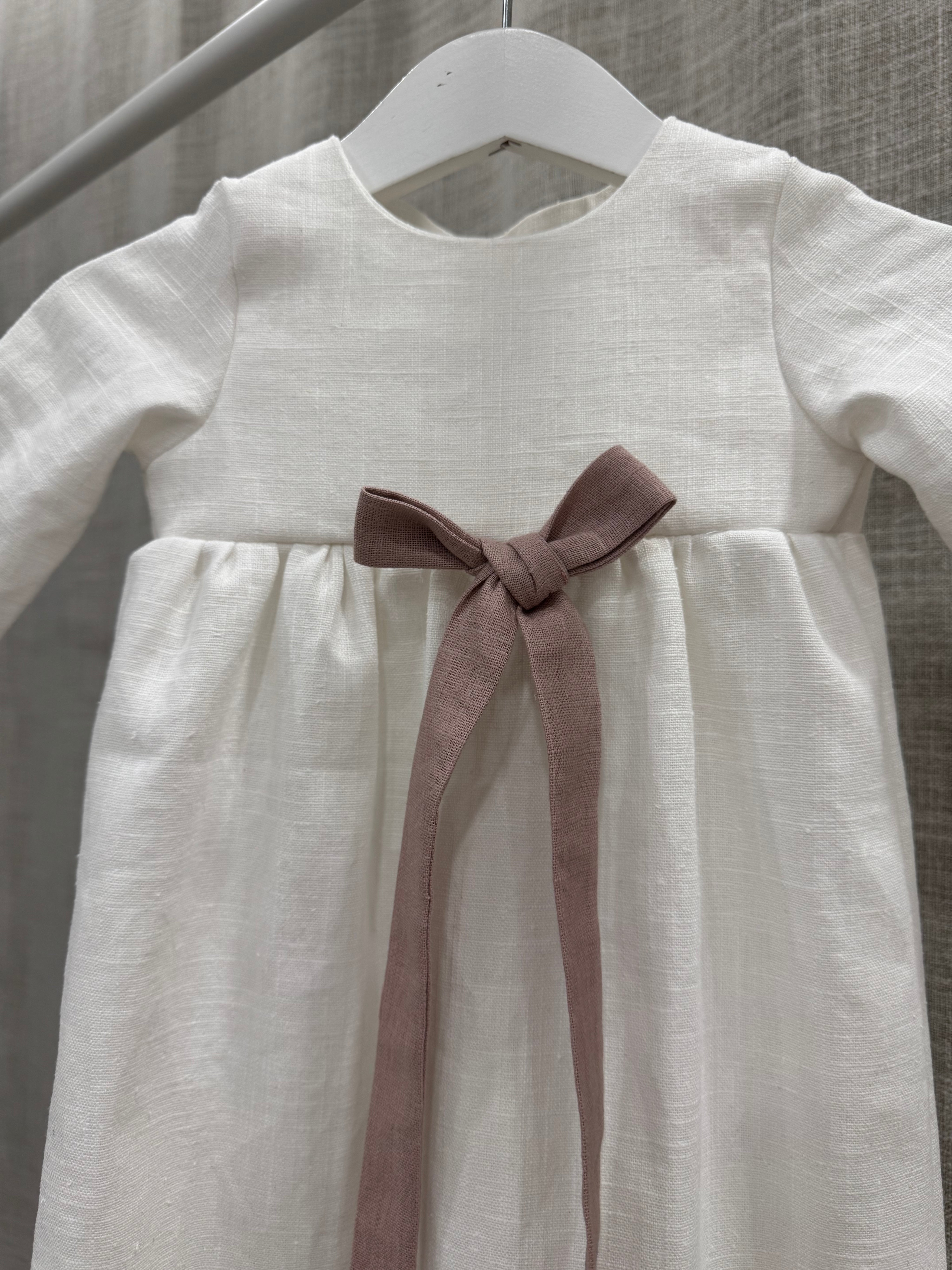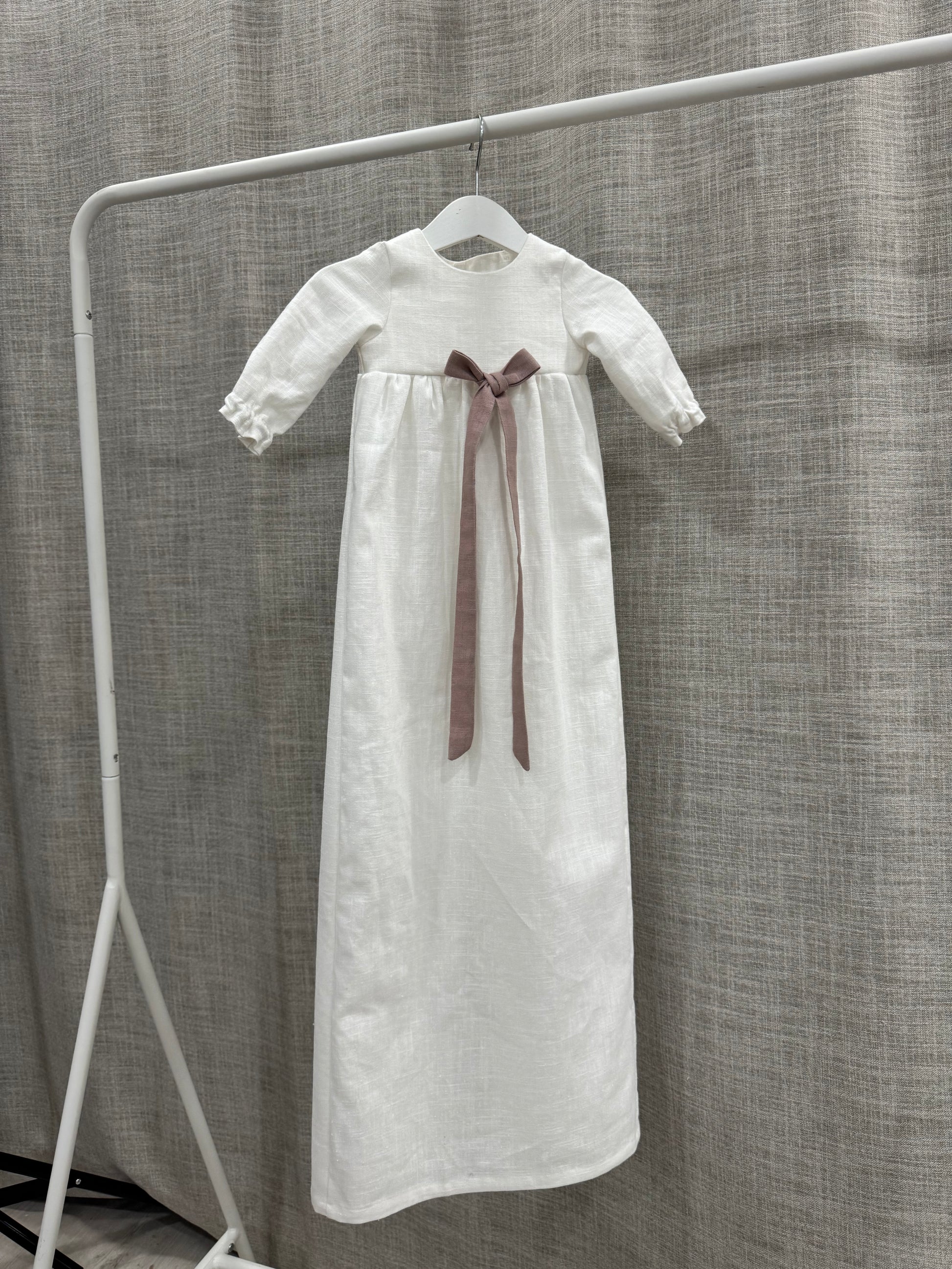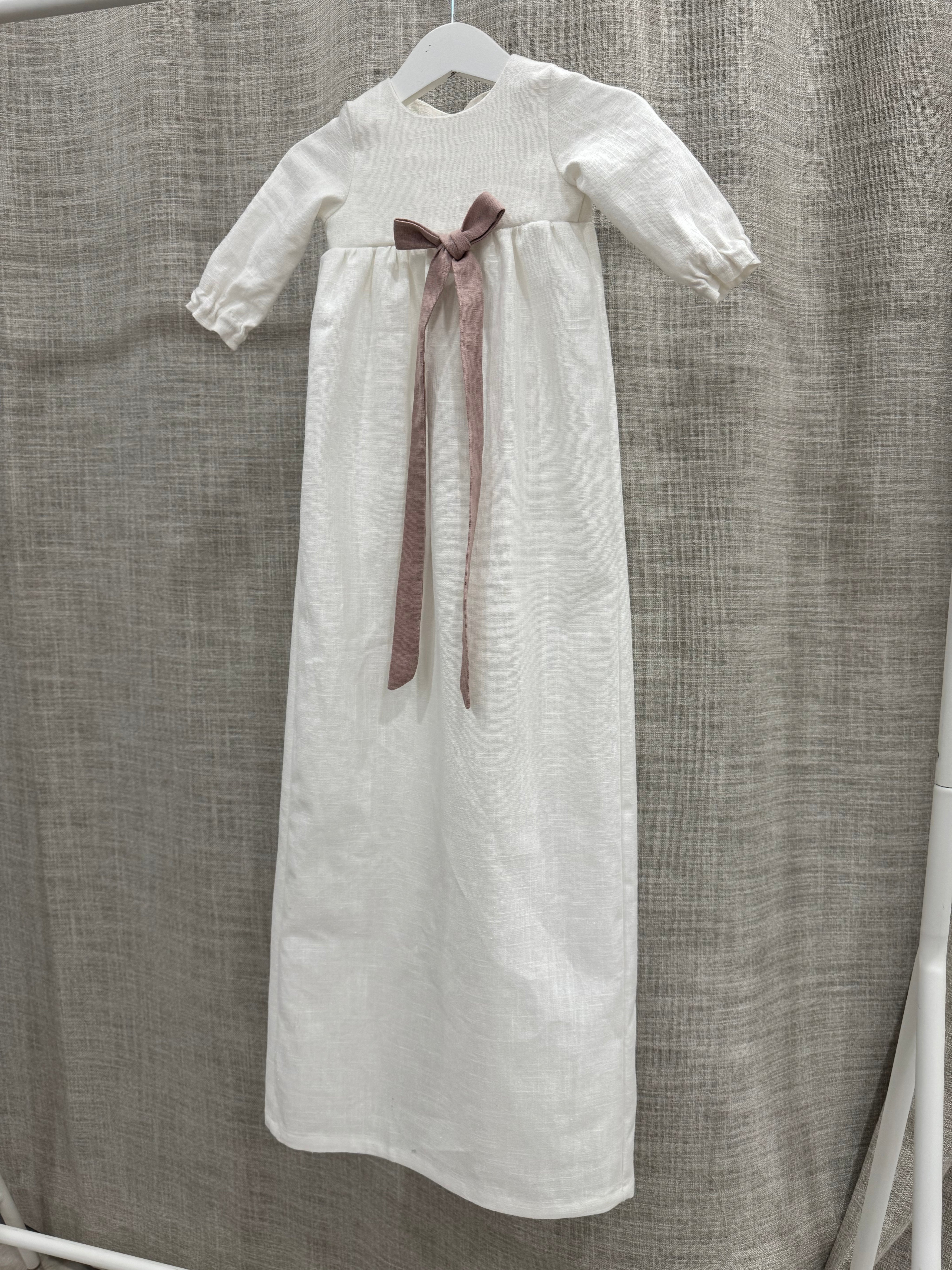 Nykyaikainen, yksinkertainen kastemekko pellavasta. Mekossa on napit yläosassa ja pitkä takaa avoin helma. Hihansuissa on kuminauhat ja pienet rypytykset. Mekko sopii koossa 50-62cm.