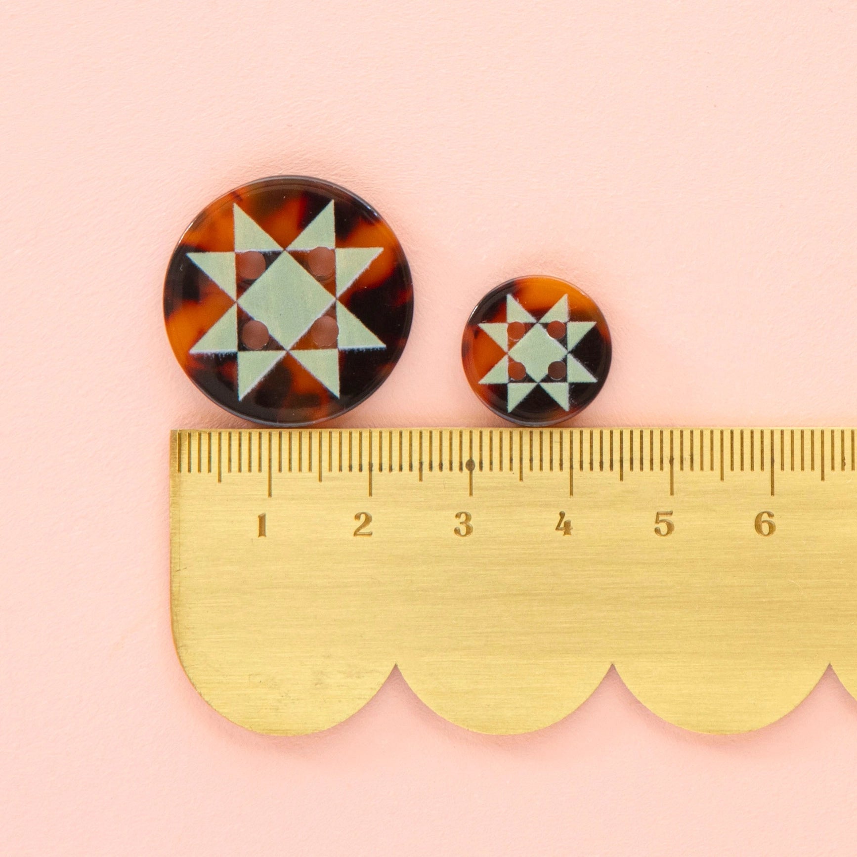 Pyöreät 2,5cm napit. Paketissa kuusi nappia. Valmistettu ympäristöystävällisestä selluloosa-asetaatista.